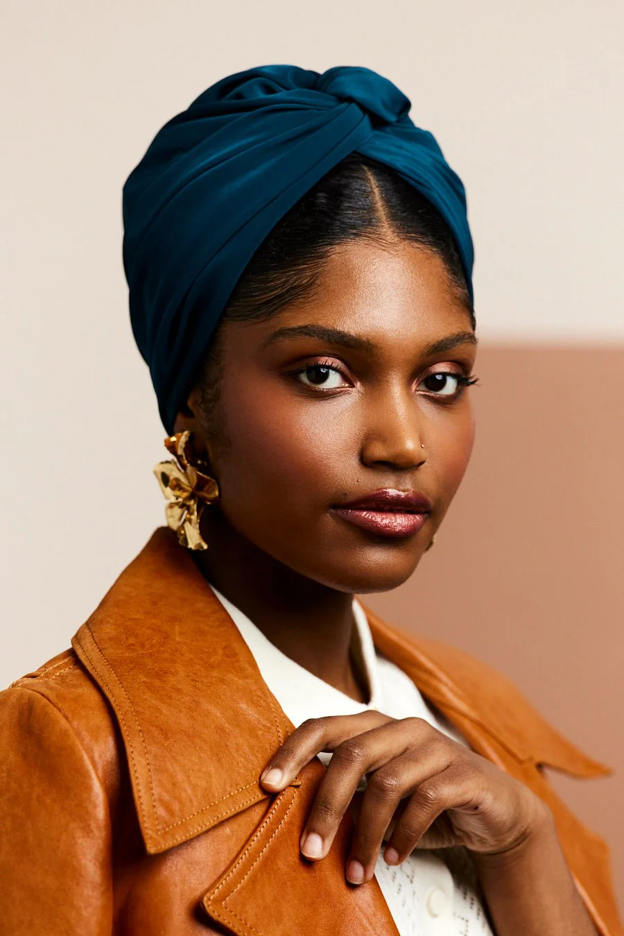 Avec sa couleur bleu canard profond, ce turban prêt à enfiler est un véritable atout pour ajouter une touche de sophistication et d’audace à votre tenue. Son coloris intense rehausse votre look tout en restant élégant.