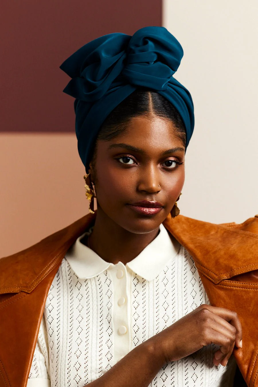 Pour un look plus audacieux et exotique, portez-le en volume en forme de fleur et n'hésitez pas à l'associer avec des couleurs plus fortes comme le moutarde, ou le Camel pour un contraste harmonieux mais plus inattendu.