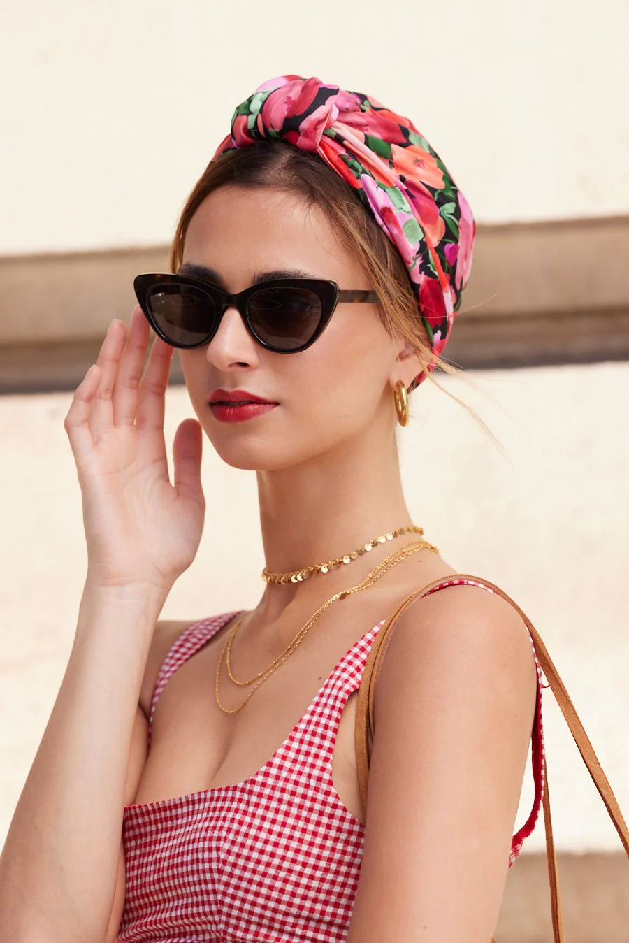 Turban à motif fleuri vif et intense sur fond rose fuchsia. Gabriella est l’accessoire fort pour un look rétro chic ou une silhouette estivale affirmée.